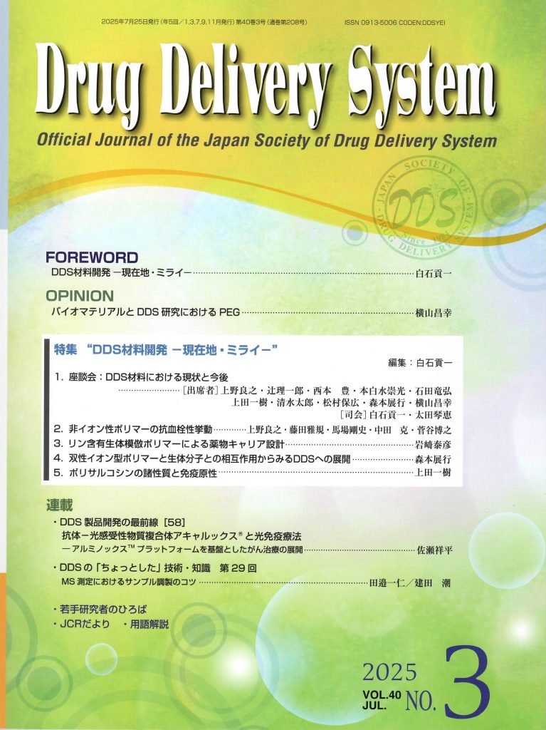 Drug Delivery System (DDS) 投稿日: 2025年8月1日2025年8月1日 投稿者: biomat 日本DDS学会 学会誌 Drug Delivery System (DDS)に総説が掲載されました。 岩﨑泰彦*. リン含有生体模倣ポリマーによる薬物キャリアの設計. Drug Delivery System 2005, 40, 187-196.