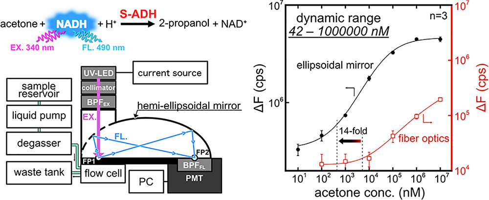 IItani K, Horiguchi Y, Zhang G, Ichikawa K, Toma K, Arakawa T, Iwasaki Y, Mitsubayashi K*. Highly sensitive fluorometric acetone biosensor using hemi-ellipsoidal mirror optics for efficient light collection, ACS sensors, in press.