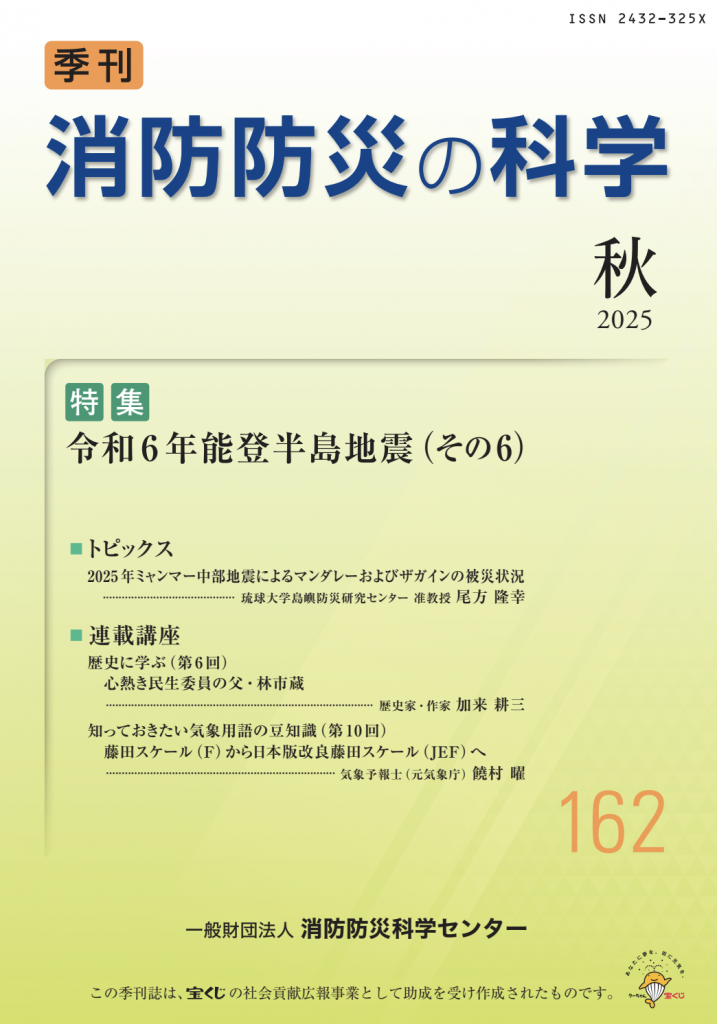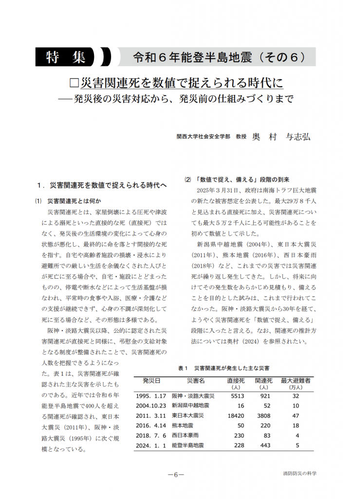 論文公開:災害関連死を数値で捉えられる時代に 〜発災後の災害対応から、発災前の仕組みづくりまで〜 投稿日: 2025年12月21日2025年12月21日 投稿者: bosai 2025年11月,論文が公開されました. 奥村与志弘,災害関連死を数値で捉えられる時代に一発災後の災害対応から、発災前の仕組みづくりまで,,消防防災の科学,No.162,pp.6-13,2025. こちらから閲覧できます