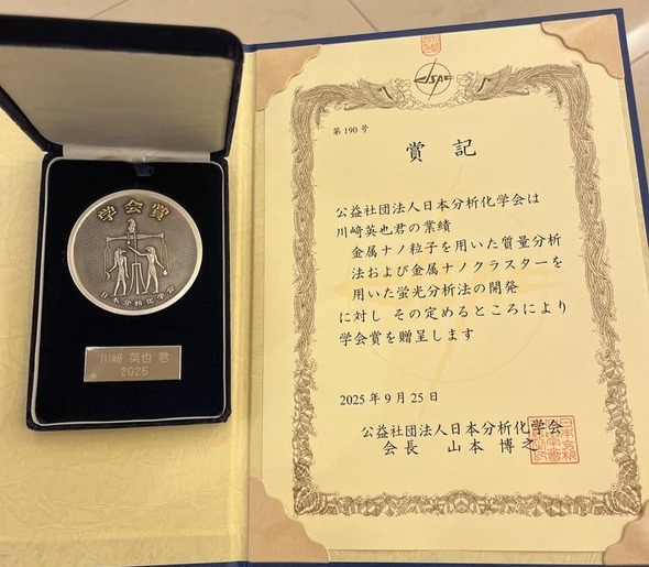 川﨑教授が2025年度日本分析化学会 学会賞を受賞しました。受賞タイトルは「金属ナノ粒子を用いた質量分析法および金属ナノクラスターを用いた蛍光分析法の開発」