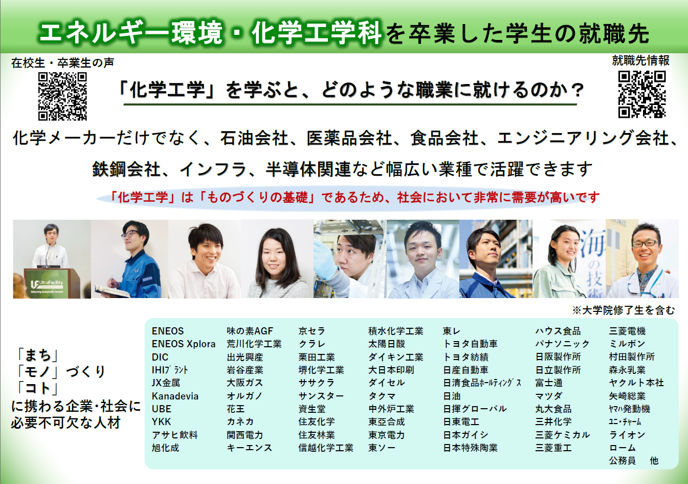 パンフレット・記事 画像をクリックしてご覧ください。 学科公式チラシ(両面) プラントづくり編チラシ(片面) SDGs編 (Ver.1) チラシ(両面) SDGs編 (Ver.2) チラシ(両面) 地球編チラシ(両面) 高校の授業科目との関連・進路編チラシ(片面) 高校生向け資料(エネルギー環境・化学工学科ってどんな学科?) 高校生向け資料(エネルギー環境・化学工学科を卒業した学生の就職先)