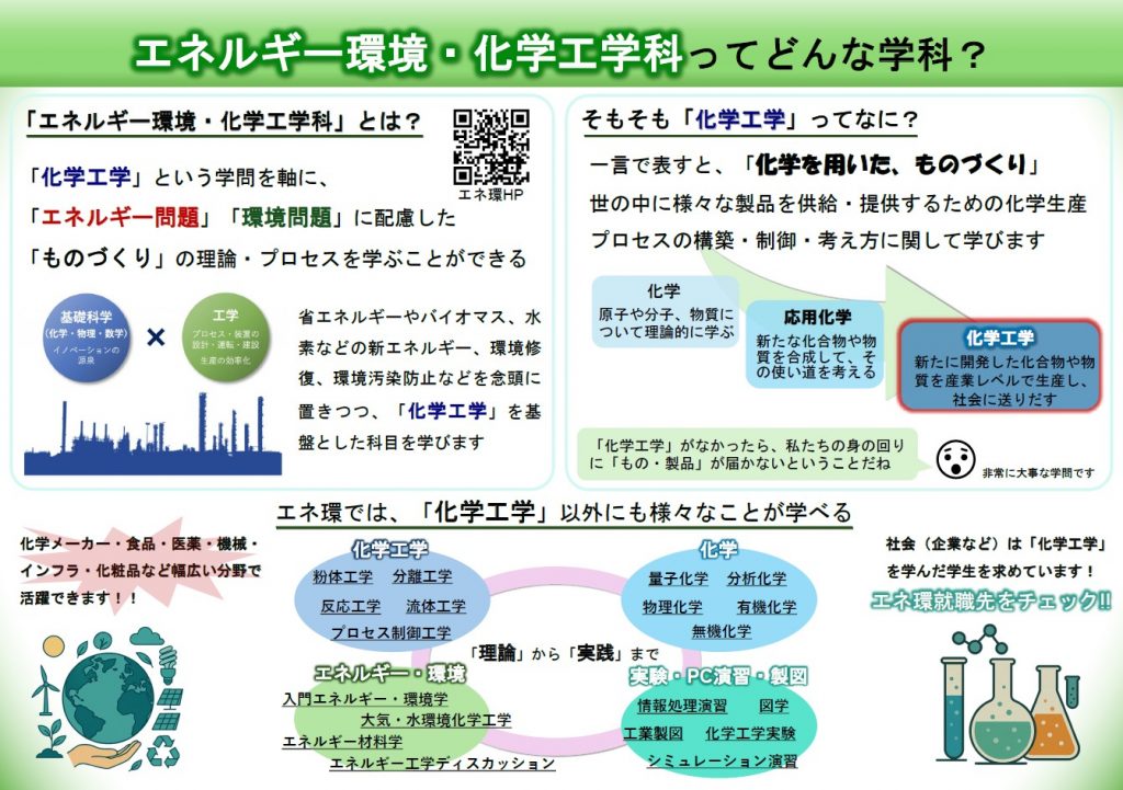パンフレット・記事 画像をクリックしてご覧ください。 学科公式チラシ(両面) プラントづくり編チラシ(片面) SDGs編 (Ver.1) チラシ(両面) SDGs編 (Ver.2) チラシ(両面) 地球編チラシ(両面) 高校の授業科目との関連・進路編チラシ(片面) 高校生向け資料(エネルギー環境・化学工学科ってどんな学科?) 高校生向け資料(エネルギー環境・化学工学科を卒業した学生の就職先)