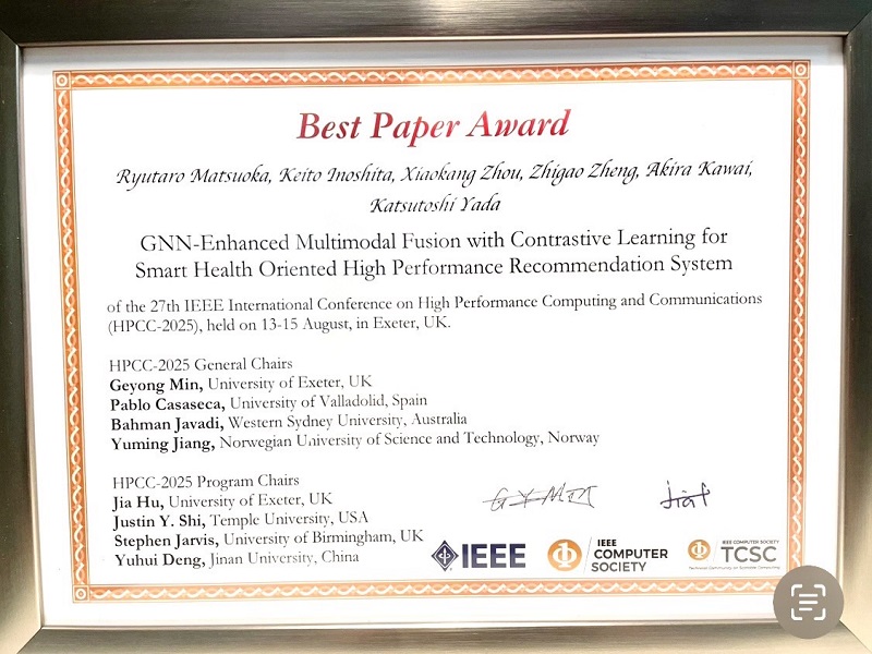 2025年8月13日~15日に英国エクセターで開催された第27回 IEEE International Conference on High Performance Computing and Communications(IEEE HPCC)に参加した。IEEE HPCCは27年の歴史を持つ国際会議であり、世界各国から研究者が集まり、活発な議論が行われる。今年度は採択率が30%で、合計109件の採択論文の中から、私の論文がBest Paper Awardに選出された。