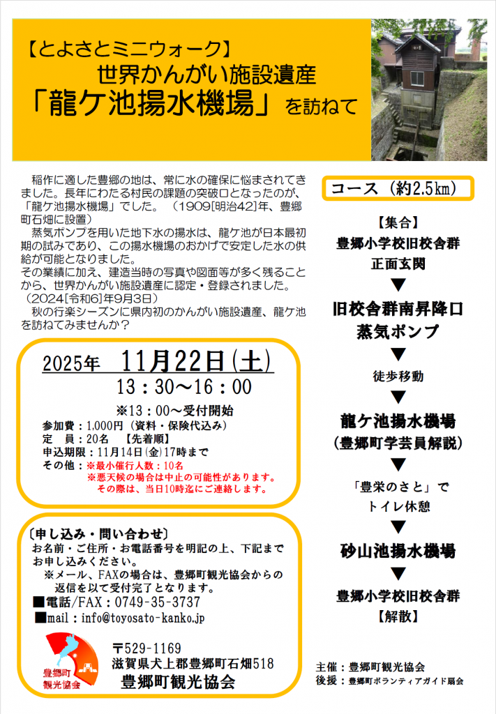 ウォーキングイベント「世界かんがい施設遺産『龍ケ池揚水機場』を訪ねて」が開催されます。