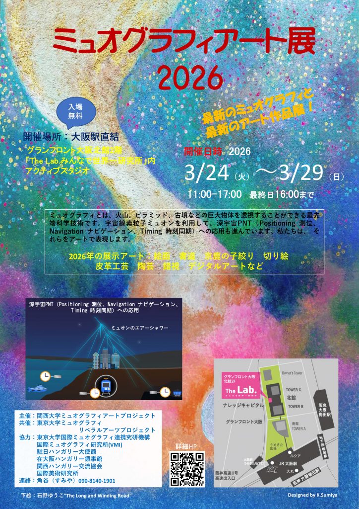 ミュオグラフィとは、火山、ピラミッド、古墳などの巨大物体を透視することができる最先端科学技術です。宇宙線素粒子ミュオンを利用して、深宇宙PNT(Positioning 測位、Navigation ナビゲーション、Timing 時刻同期)への応用も進んでいます。私たちは、 それらをアートで表現します。