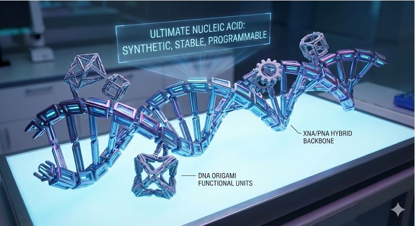 We proposed a concept for developing the ultimate nucleic acid = Omega Nucleic Acid (ΩNA), suitable for use in extreme environments such as living organisms and outer space. The photo shows the “ultimate nucleic acid” conceived by Google Gemini (not used in the paper).