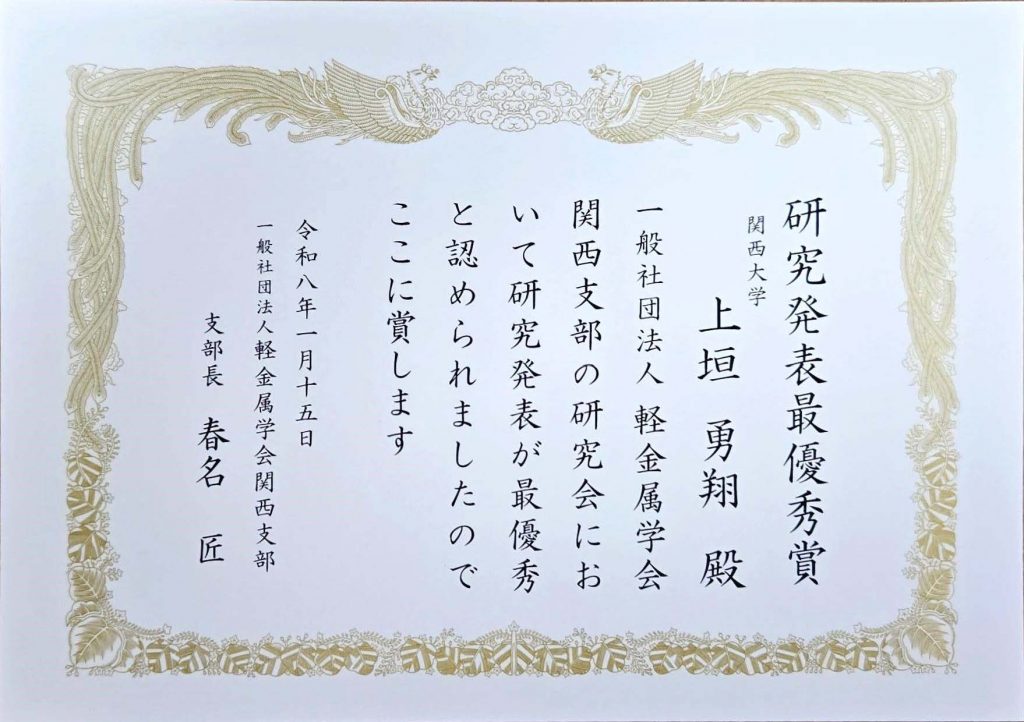 上垣勇翔君(M1)が,軽金属学会関西支部 令和7年度若手研究者・院生による研究発表会の口頭発表セッション で「研究発表最優秀賞」を受賞 2026年1月16日2026年1月31日 sel 上垣勇翔君(M1)が,軽金属学会関西支部 令和7年度若手研究者・院生による研究発表会の口頭発表セッション で「研究発表最優秀賞」を受賞しました. 発表者6名の中から上垣君1名が表彰されました. おめでとう!